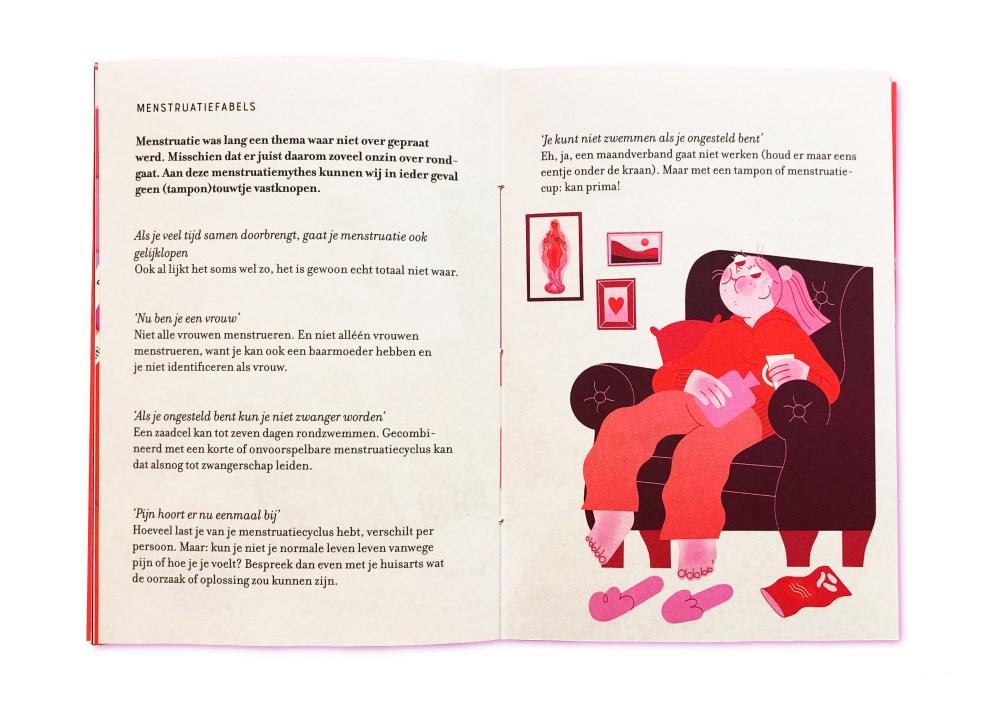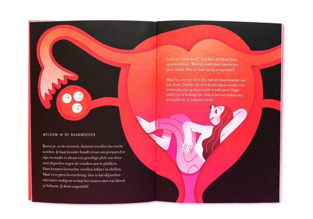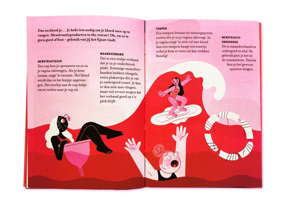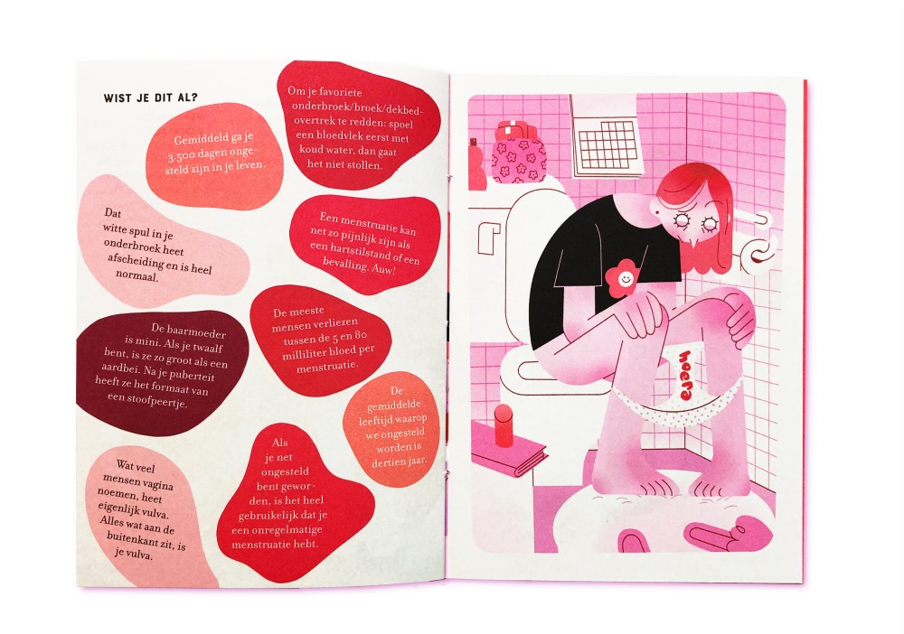 For publishing house Loopvis I’ve illustrated the booklet “Ongesteld. Hoera?” (“Period. Hooray?”) about getting your period for the first time. It contains 8 colorful and funny illustrations that show the duality of becoming a woman. The text is written by the Menstruatiemeisjes (Menstruation Girls).