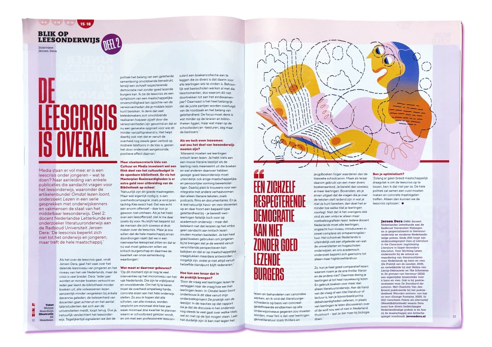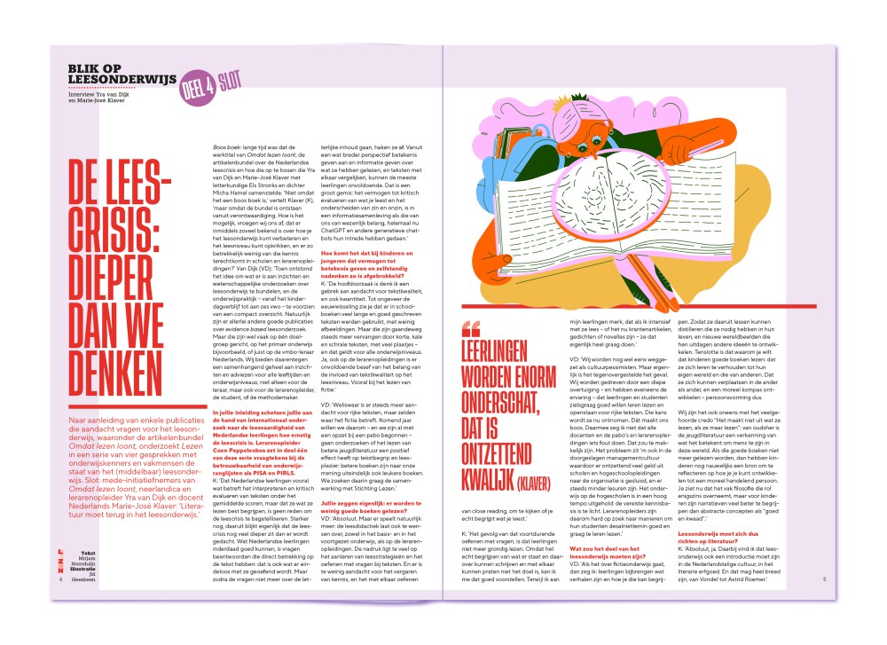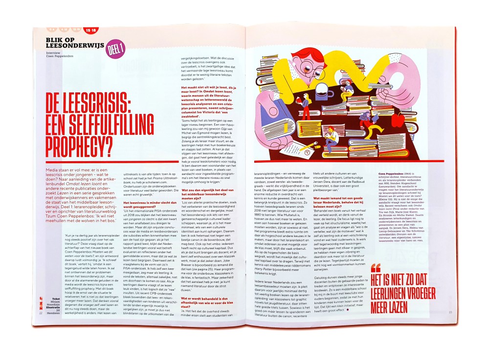 In 2023 I have made illustrations for all 4 editions of “Lezen”, a magazine about reading and literature education. In every interview another person gives their opinion on the reading crisis in Dutch education.